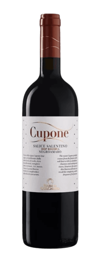 Made from 100% Negroamaro from 50-year-old alberello vines in Guagnano's Cupone district, known for soil rich in depressions and underground rivers. Hand-harvested in mid-September with two-week maceration. Aged twenty-four months total: twelve months in 5-hectoliter French oak barrels plus twelve months bottle aging. Particular brightness and consistency with austere, unique character. Aromas of walnut and Mediterranean herbs. Soft tannins with balsamic notes on palate. Produced only in exceptional vintages. Pairs with hearty meats, aged cheeses and dark chocolate.