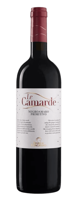 Made from 100% Negroamaro grapes hand-harvested in mid-September from espalier vineyards around Guagnano. Grapes macerate ten days at 26-28°C in stainless steel, followed by six months aging in French oak barriques. Intense red colour with marked aromas of plum and cherry. Full and well-balanced palate with spiced, slightly roasted notes and elegant tannins, soft floral hints of violet. Ready to drink immediately or cellar for 4-5 years. Pairs with meat or vegetable pasta, stewed meats and meatballs.